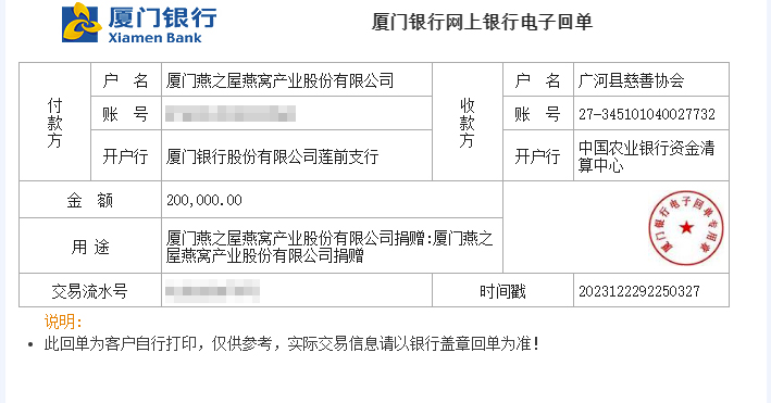 圖:燕之屋向甘肅省臨夏州積石山縣捐贈救災資金20萬元