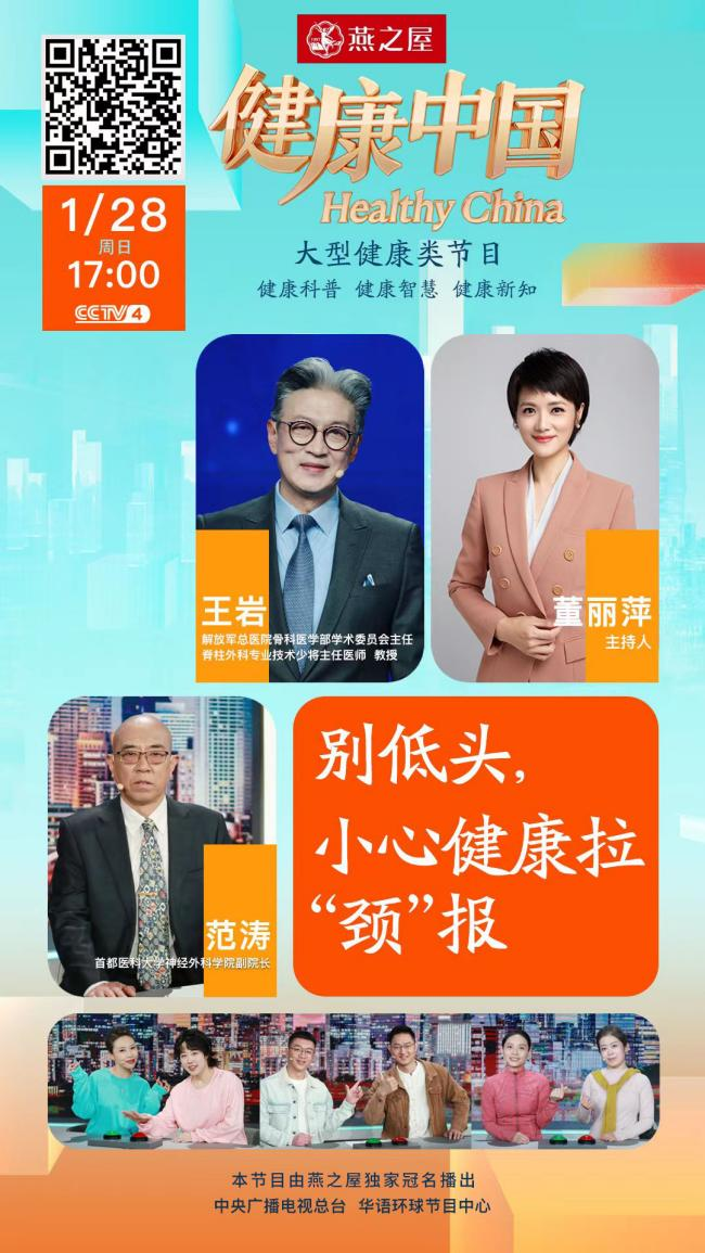 低頭,一個不引人注意的姿勢,卻能誘發(fā)疼痛。日常生活中有太多不經(jīng)意的瞬間會讓我們低頭,而這一瞬間的姿勢往往會定格成一幅畫面——長時間的頸椎壓迫狀態(tài)。本期,由燕之屋獨家冠名的CCTV-4大型健康類欄目《健康中國》特邀首都醫(yī)科大學神經(jīng)外科學院副院長范濤和解放軍總醫(yī)院骨科醫(yī)學部學術委員會主任,脊柱外科專業(yè)技術少將主任醫(yī)師,教授王巖,共同為觀眾帶來專業(yè)的醫(yī)學科普,拯救頸椎健康。