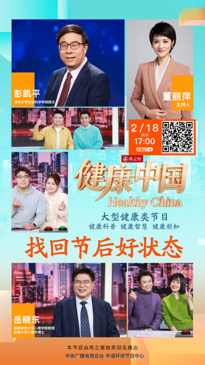 本期,由燕之屋獨家冠名的CCTV-4大型健康類欄目《健康中國》特邀首都師范大學心理學院教授、哈佛大學心理學博士岳曉東和清華大學社會科學學院院長彭凱平教授,以及北京大學第三醫(yī)院運動醫(yī)學科的苗欣博士,與您共同探討如何找回節(jié)后好狀態(tài)。