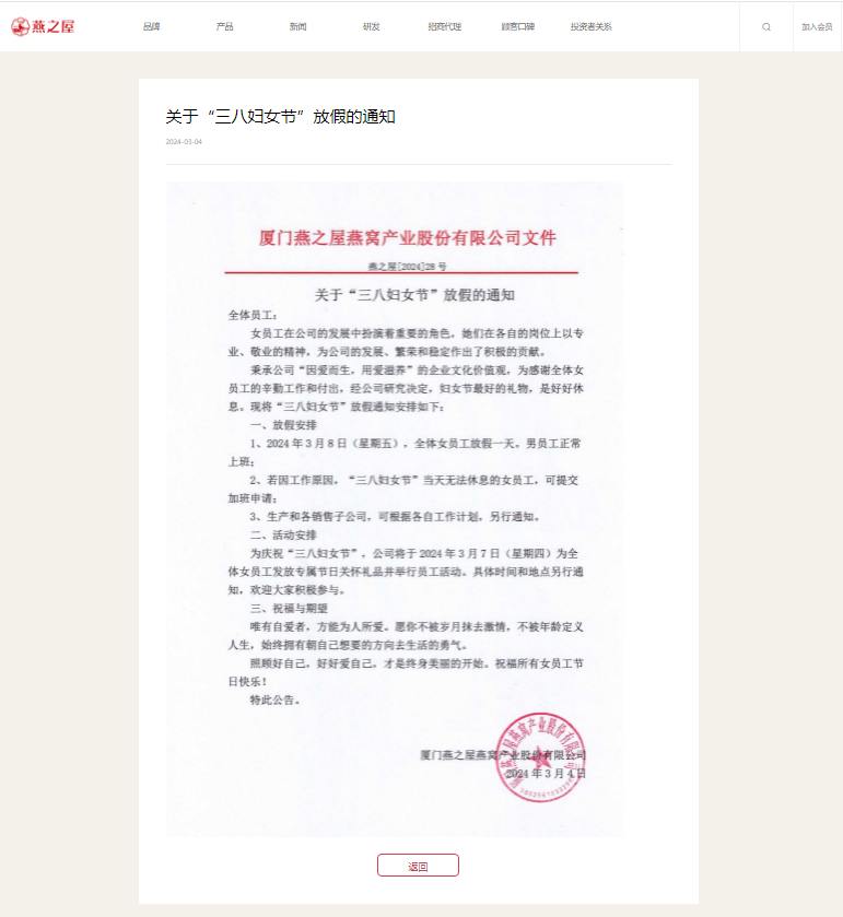 圖:燕之屋發(fā)布“三八婦女節(jié)”放假通知