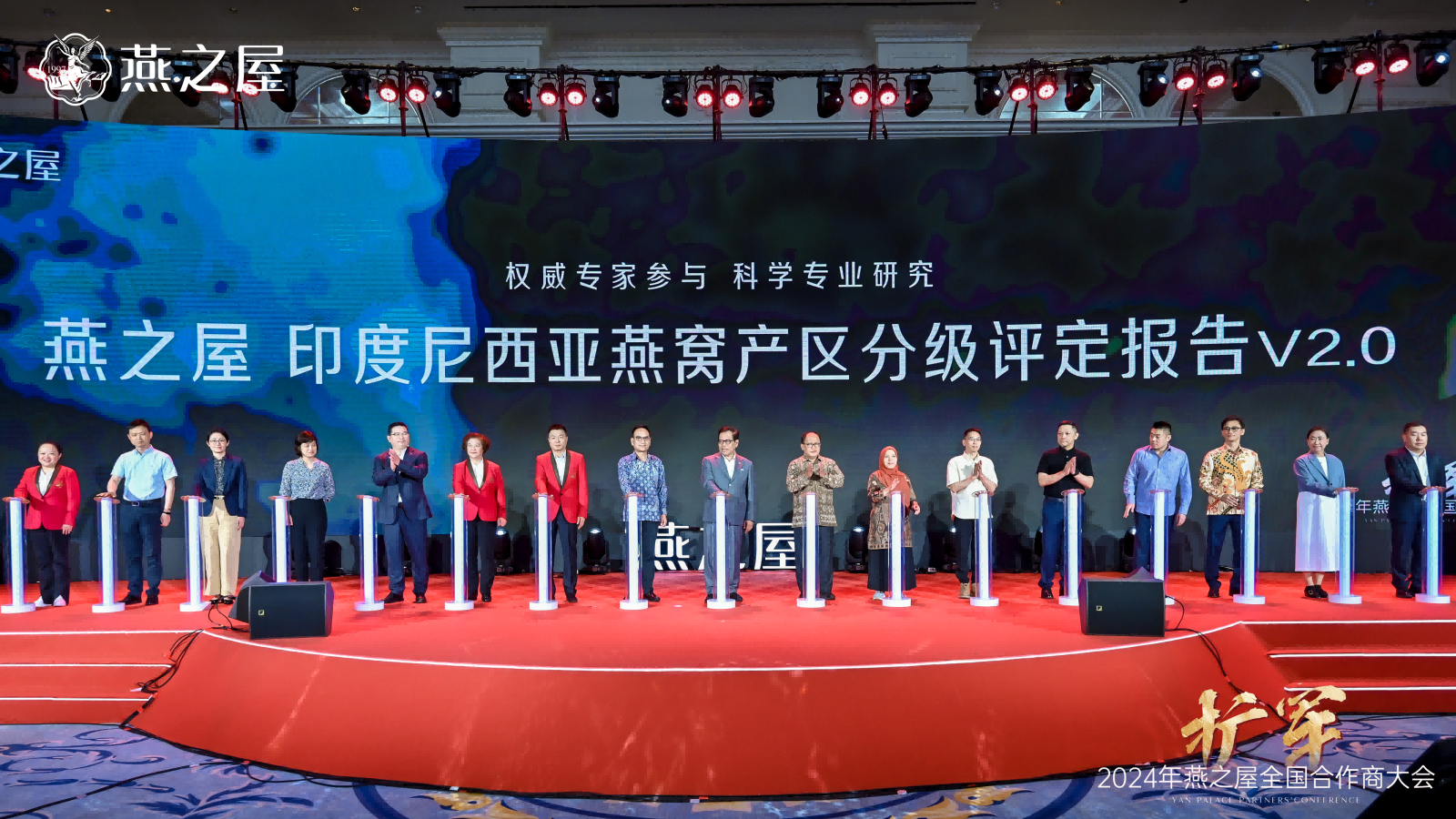 隨后,印度尼西亞駐華大使周浩黎,印度尼西亞動植物檢疫標準檢驗中心主任斯利揚托,廈門海關(guān)技術(shù)中心、國家燕窩及燕窩制品檢測重點實驗室主任徐敦明,印度尼西亞動植物檢疫標準檢驗中心研究員海爾米,印度尼西亞燕窩協(xié)會養(yǎng)護部部長安東,印度尼西亞燕窩協(xié)會國際貿(mào)易部副部長何文輝,江南大學未來食品科學中心鐘芳教授、陳茂深教授,華南理工大學食品科學與工程學院任嬌艷教授,印度尼西亞027工廠董事長魯?shù)?,印度尼西?04工廠普爾沃蘇特里斯諾,印度尼西亞014工廠露西亞娜,燕之屋執(zhí)行董事、副董事長鄭文濱,燕之屋執(zhí)行董事、總裁李有泉,燕之屋董事、副總經(jīng)理、供應(yīng)鏈中心總經(jīng)理黃丹艷,燕之屋副總經(jīng)理、研發(fā)技術(shù)總監(jiān)范群艷,燕之屋供應(yīng)鏈中心總監(jiān)魏溦等領(lǐng)導(dǎo)和嘉賓共同啟動發(fā)布《燕之屋印度尼西亞燕窩產(chǎn)區(qū)分級評定報告V2.0》。這標志著燕之屋在專業(yè)化、標準化、高質(zhì)量發(fā)展上更進一步。