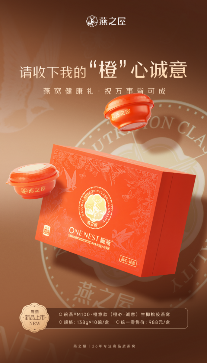 近日,燕之屋旗下高端燕窩品牌“碗燕”重磅推出新品碗燕®M100·橙意款(橙心·誠意)生椰桃膠燕窩,天然薈萃、匠心品質(zhì),呈現(xiàn)“橙”心誠意的燕窩健康禮,為日常送禮提供滋養(yǎng)優(yōu)選。