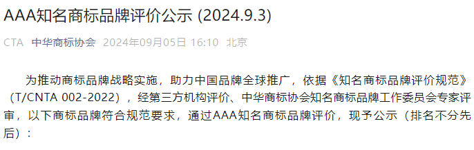 AAA知名商標(biāo)品牌,是根據(jù)《知名商標(biāo)品牌評(píng)價(jià)規(guī)范》T/CNTA 002-2022團(tuán)體標(biāo)準(zhǔn),經(jīng)第三方評(píng)價(jià)機(jī)構(gòu)現(xiàn)場(chǎng)評(píng)價(jià)、由中華商標(biāo)協(xié)會(huì)知名商標(biāo)品牌評(píng)價(jià)專家評(píng)審會(huì)審核批準(zhǔn)后,授予的榮譽(yù)稱號(hào)。這一標(biāo)準(zhǔn)由中華商標(biāo)協(xié)會(huì)聯(lián)合多家科研院所、專業(yè)協(xié)會(huì)、行業(yè)機(jī)構(gòu)和新聞媒體共同制定,旨在引導(dǎo)我國(guó)企業(yè)建立商標(biāo)品牌創(chuàng)造、運(yùn)用、管理和保護(hù)體系,積極推進(jìn)商標(biāo)品牌戰(zhàn)略實(shí)施,培育具有市場(chǎng)競(jìng)爭(zhēng)力、國(guó)際影響力的知名商標(biāo)品牌。燕之屋“碗燕”商標(biāo)榮獲AAA知名商標(biāo)品牌稱號(hào),是“碗燕”品牌贏得專業(yè)機(jī)構(gòu)認(rèn)可的充分證明,也見證了燕之屋“碗燕”作為中國(guó)品牌向前邁進(jìn)堅(jiān)實(shí)的一步。
